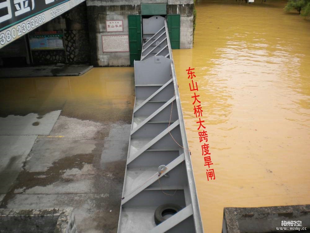 東山大橋旱閘閘門孔口尺寸為22m×3.7m(寬×高),閘門底檻高程77.21m(珠基,下同)。屬超大跨度的旱閘工程。其設(shè)計、制造、運輸和安裝的技術(shù)要求高。由我公司承建,該工程于2006年初動工,經(jīng)過半年緊張施工,在各參建單位的共同努力下,于2006年6月11日一次整體吊裝成功。2007年度被省水利學(xué)會評為科學(xué)技術(shù)三等獎;2008年度獲梅州市科技進步三等獎。